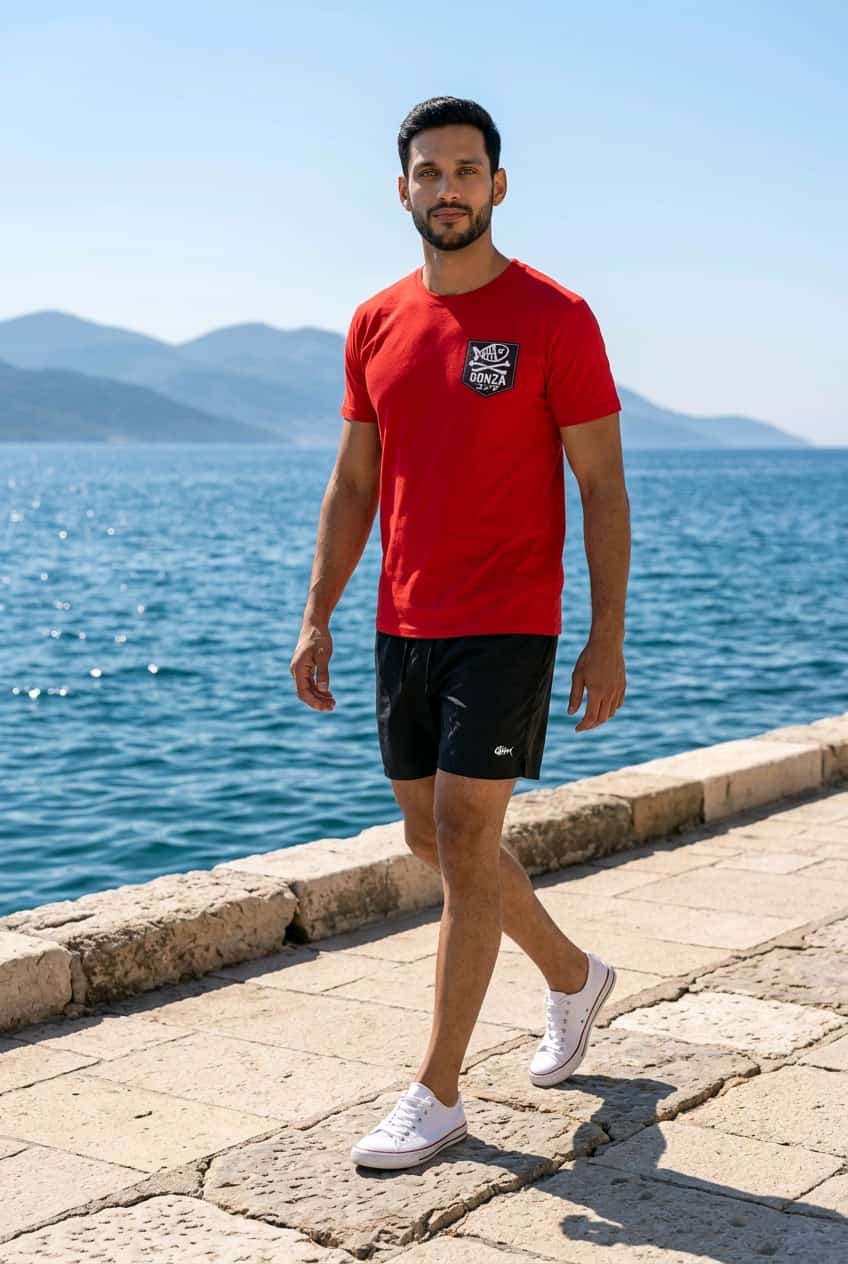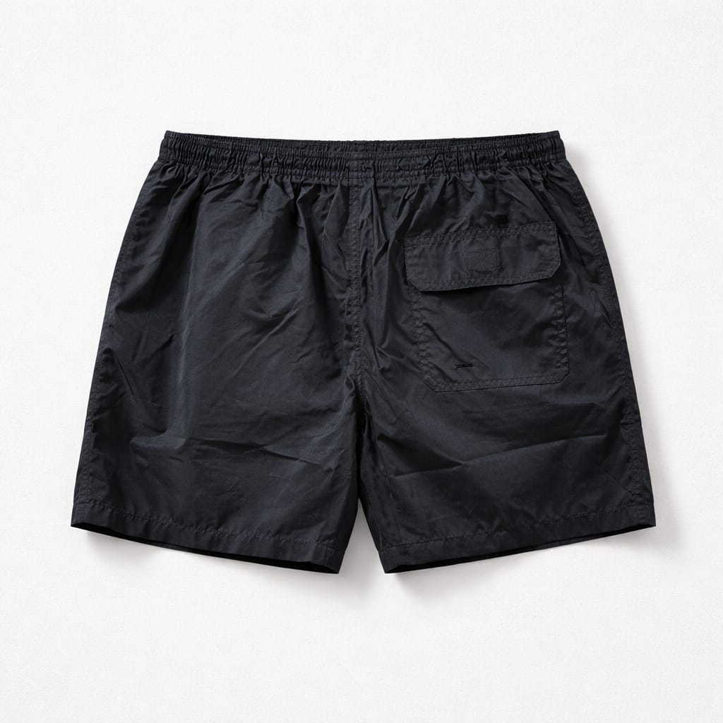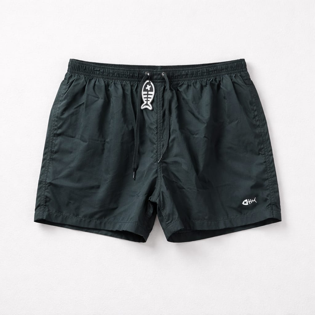 Color: negro Material: Confeccionado en un tejido sintético de secado rápido, ideal para el uso en playa o piscina. Cintura: Elástica para mayor comodidad, complementada con un cordón ajustable en el mismo tono azul. Logotipo: Presenta el emblema de la marca (un esqueleto de pez blanco) bordado en la parte inferior de la pierna izquierda y también integrado de forma decorativa en los herrajes del cordón. Corte: Estilo de largo medio, con un ajuste recto que ofrece libertad de movimiento.
