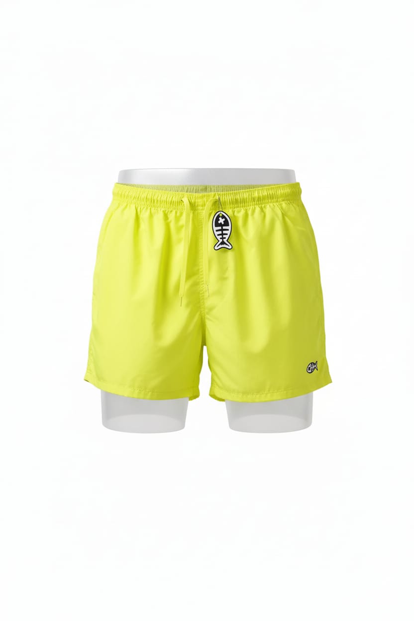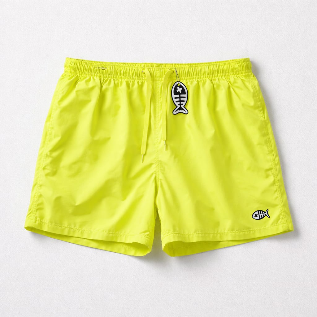 Detalles del Diseño: Color: Amarillo neon fluorescente Material: Confeccionado en un tejido sintético de secado rápido, ideal para el uso en playa o piscina. Cintura: Elástica para mayor comodidad, complementada con un cordón ajustable en el mismo tono azul. Logotipo: Presenta el emblema de la marca (un esqueleto de pez blanco) bordado en la parte inferior de la pierna izquierda y también integrado de forma decorativa en los herrajes del cordón. Corte: Estilo de largo medio, con un ajuste recto que ofrece libertad de movimiento.