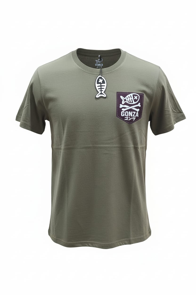 - Logotipo: En el pecho se observa el logo de la marca Gonza. El diseño incluye una ilustración blanca de un esqueleto de pez estilizado, con una "X" en lugar de ojo, posado sobre dos huesos cruzados (estilo pirata).