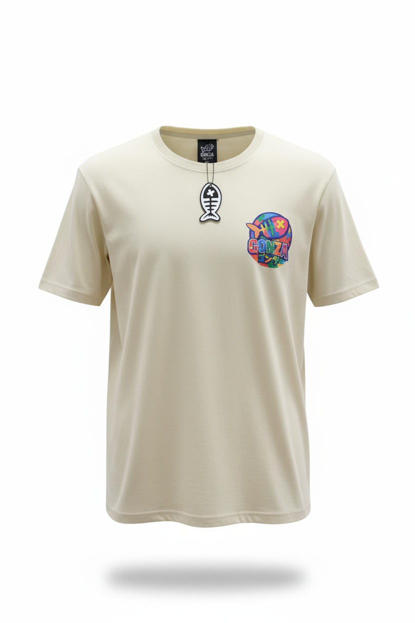 La espalda remata con un estampado grande y muy colorido en forma circular, con el icono del pez y el lettering GONZA, para que se vea claro desde lejos. El tono crema/off-white hace que los colores del diseño destaquen sin perder ese punto neutro.