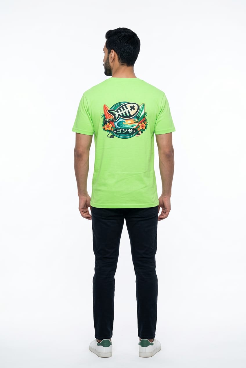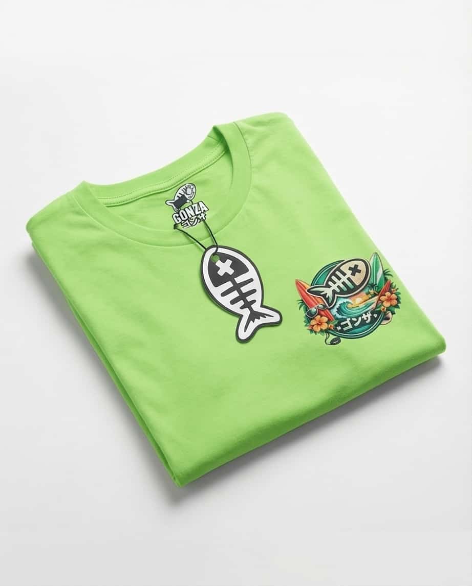 La espalda remata con un estampado grande y muy colorido en forma circular, con el icono del pez y el lettering GONZA, para que se vea claro desde lejos. El tono lima/off-white hace que los colores del diseño destaquen sin perder ese punto neutro.