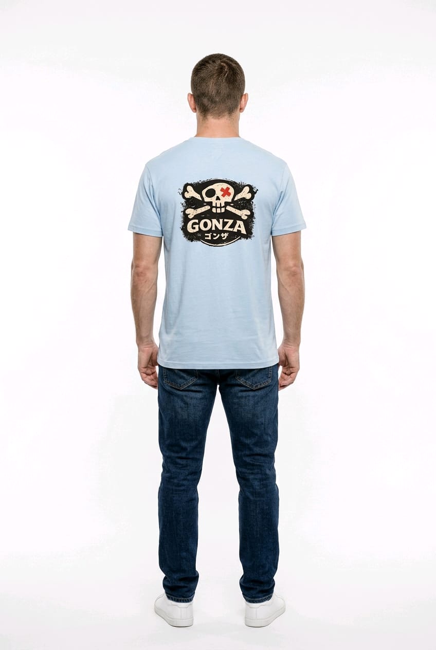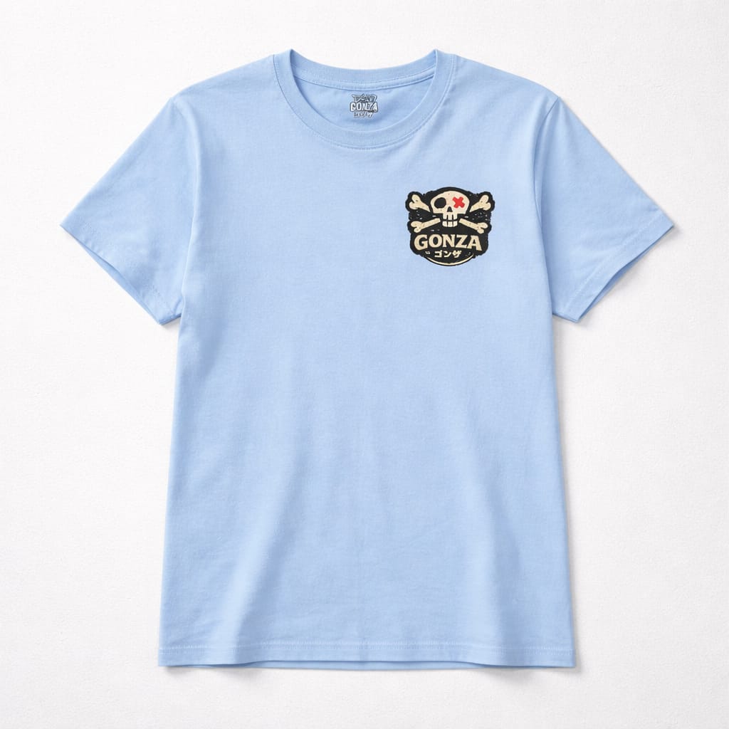 • Detalle del Gráfico: En la parte superior izquierda del pecho (lado del corazón), incluye un pequeño parche o estampado cuadrado. El diseño muestra una calavera con huesos cruzados sobre un fondo oscuro, acompañada del nombre "GONZA" en letras blancas prominentes y caracteres japoneses (katakana) debajo, que se leen como "Gonza" (ゴンザ).