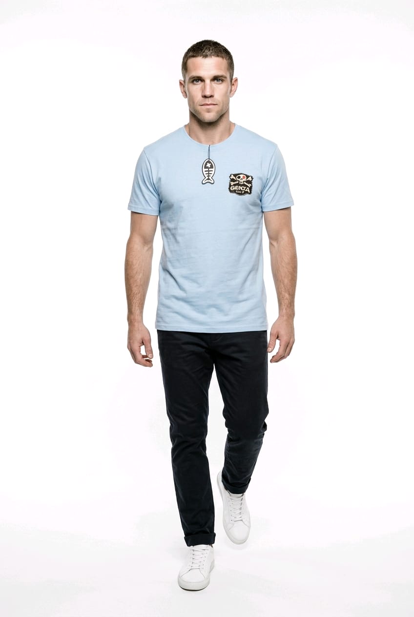 • Color y Material: Presenta un tono  azul celeste , un color versátil y común en prendas de algodón de alta calidad.