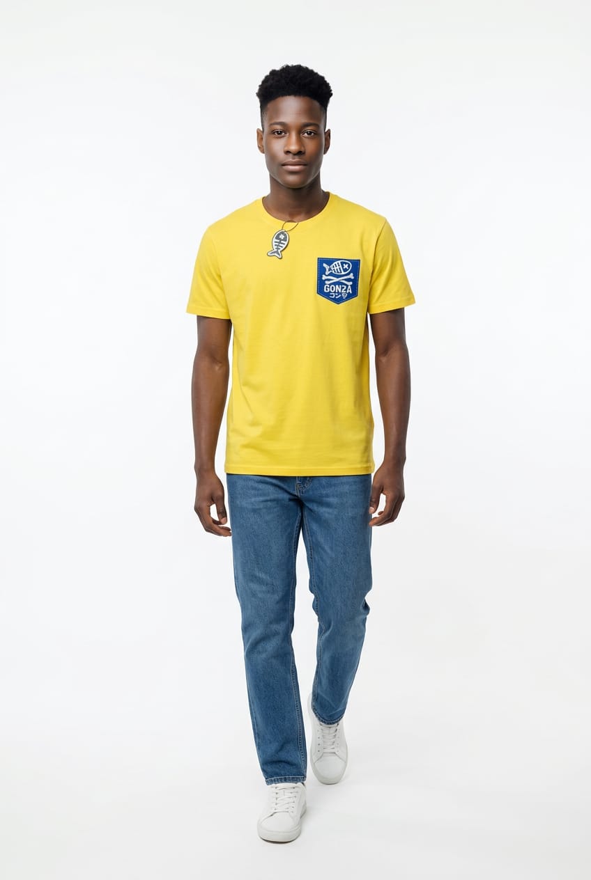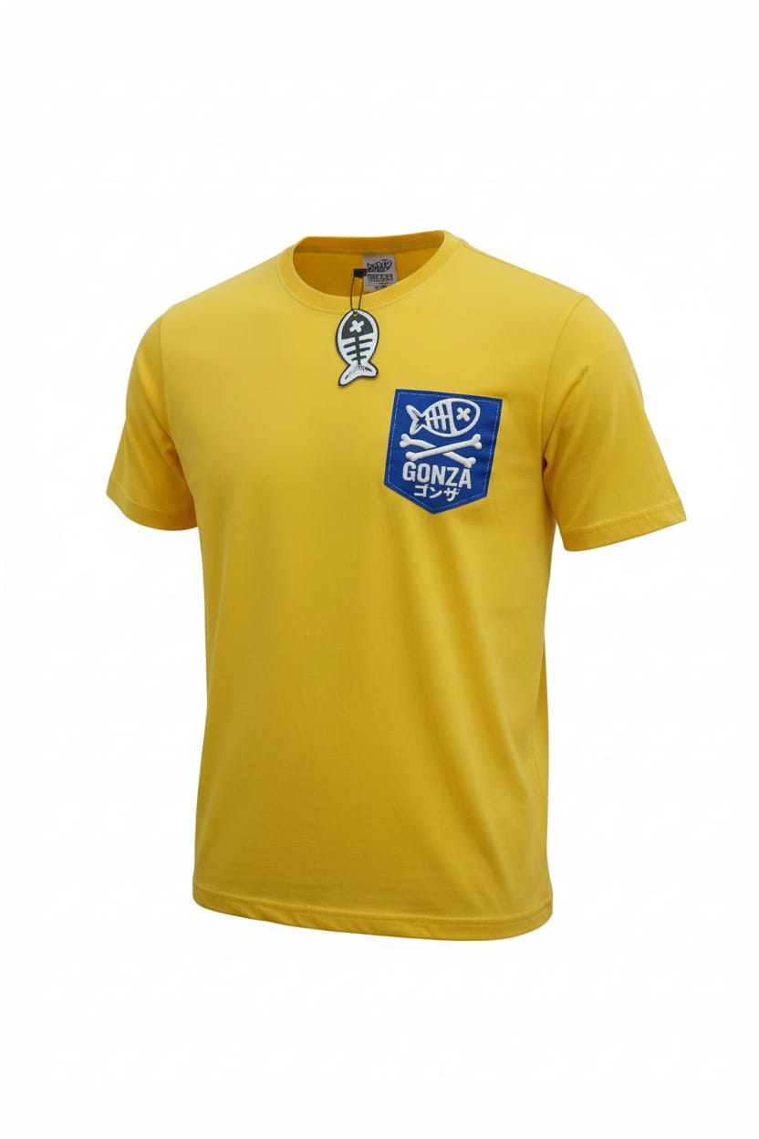 - El Parche: Presenta un parche rectangular azul en el pecho izquierdo. Contiene el gráfico característico de la marca: el esqueleto de pez con una "X" en el ojo sobre dos huesos cruzados, todo en color blanco.