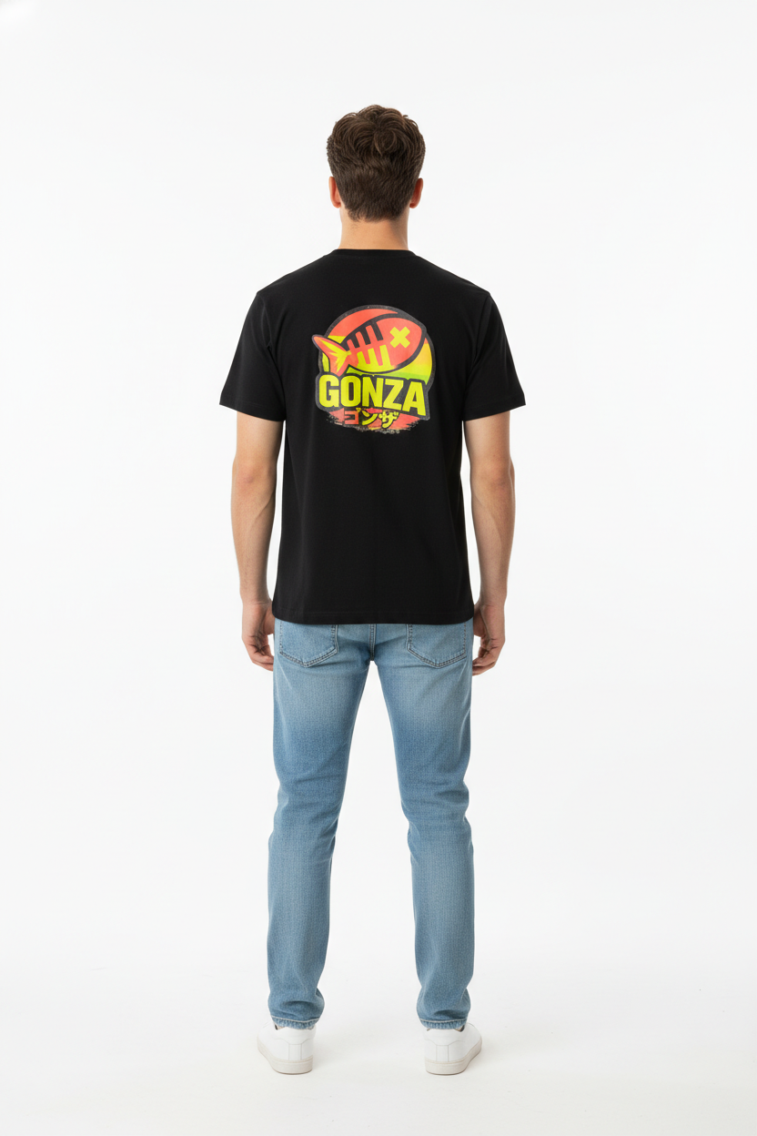 La camiseta negra GONZA apuesta por un look limpio por delante y potente por detrás: logo a color en el pecho y estampado grande en la espalda para que el diseño hable cuando te giras.