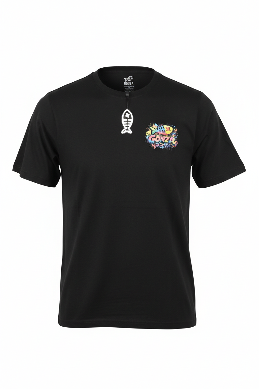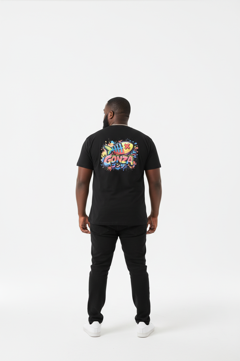 Dale un toque street a tu outfit con la Camiseta Negra GONZA Splash. Un diseño limpio por delante con el logo en el pecho y todo el protagonismo detrás con un estampado grande multicolor, tipo graffiti/splash.