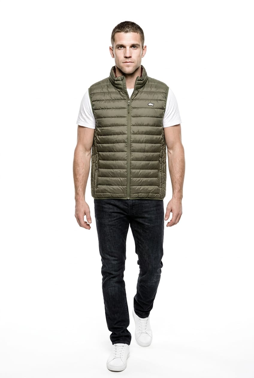 Este chaleco acolchado ligero en verde oliva está pensado para el día a día: abriga lo justo, no pesa y queda genial sobre camisetas, sudaderas o jerseys. Su cuello alto protege del aire y el diseño sin mangas te da libertad total de movimiento.