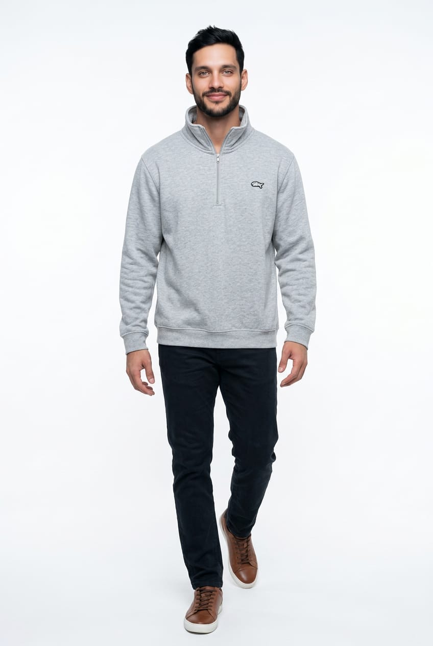 La Sudadera Half-Zip Gris Antracita – GONZA combina un estilo minimal con un toque técnico gracias a su cuello alto y media cremallera. Es una prenda pensada para el día a día: cómoda, versátil y fácil de combinar con jeans, joggers o pantalón chino.