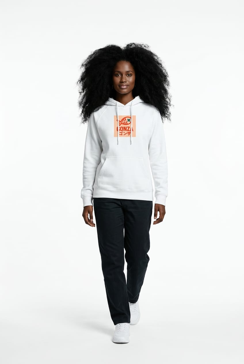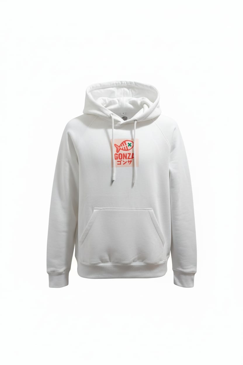 Sudadera con capucha en color blanco diseñada para quienes buscan un estilo fresco, urbano y con personalidad. Presenta el icónico logo GONZA en el pecho con el pez y las tibias cruzadas acompañado de detalles en caracteres japoneses, aportando un toque único inspirado en la cultura surf y skate.